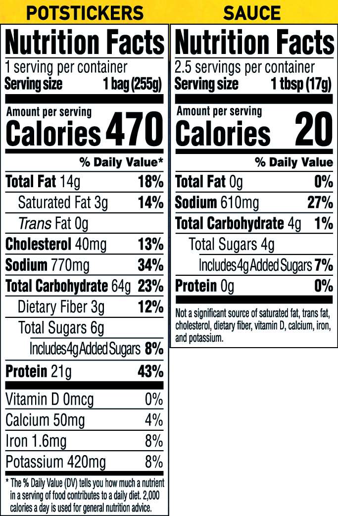 Potstickers: Vegetables (napa cabbage, green onion, garlic), pork, enriched wheat flour (wheat flour, niacin, reduced iron, thiamine mononitrate, riboflavin, folic acid), water, soy sauce (water, soybeans, wheat, salt), modified food starch, sugar, sesame oil, contains less than 2% of: ginger, salt, soy protein, dehydrated soy sauce (soy sauce [soybeans, wheat, salt], maltodextrin, salt), oyster extract (oyster, water, salt), flavoring (soy sauce powder [soy sauce {soybeans, wheat, salt}, maltodextrin], garlic powder, salt, sugar), baking powder (sodium acid pyrophosphate, sodium bicarbonate, corn starch, monocalcium phosphate), hydrolyzed soy protein, canola oil, spice, sodium phosphate.
