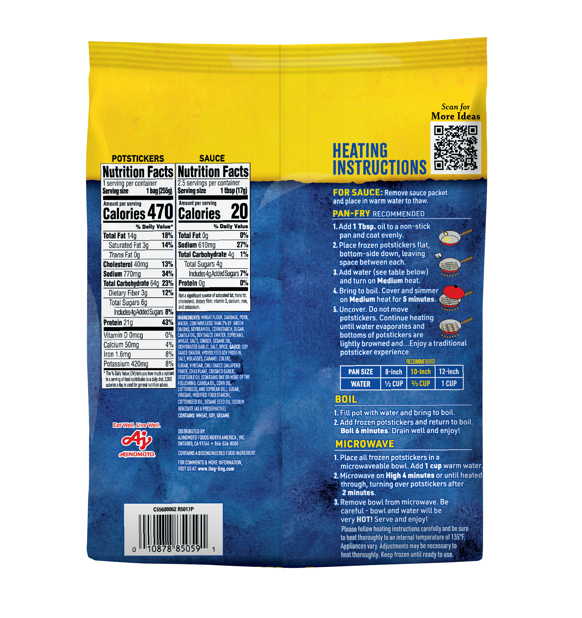 Ling Ling Pork & Vegetable Potstickers are filled with tender pork, freshly sourced vegetables, and authentic Asian seasonings for rich, savory flavor in every bite. Made from our original family recipe, these dumplings are perfectly paired with our signature savory dipping sauce. Ready in minutes and crafted to bring the true flavors of Asia straight to your table.
